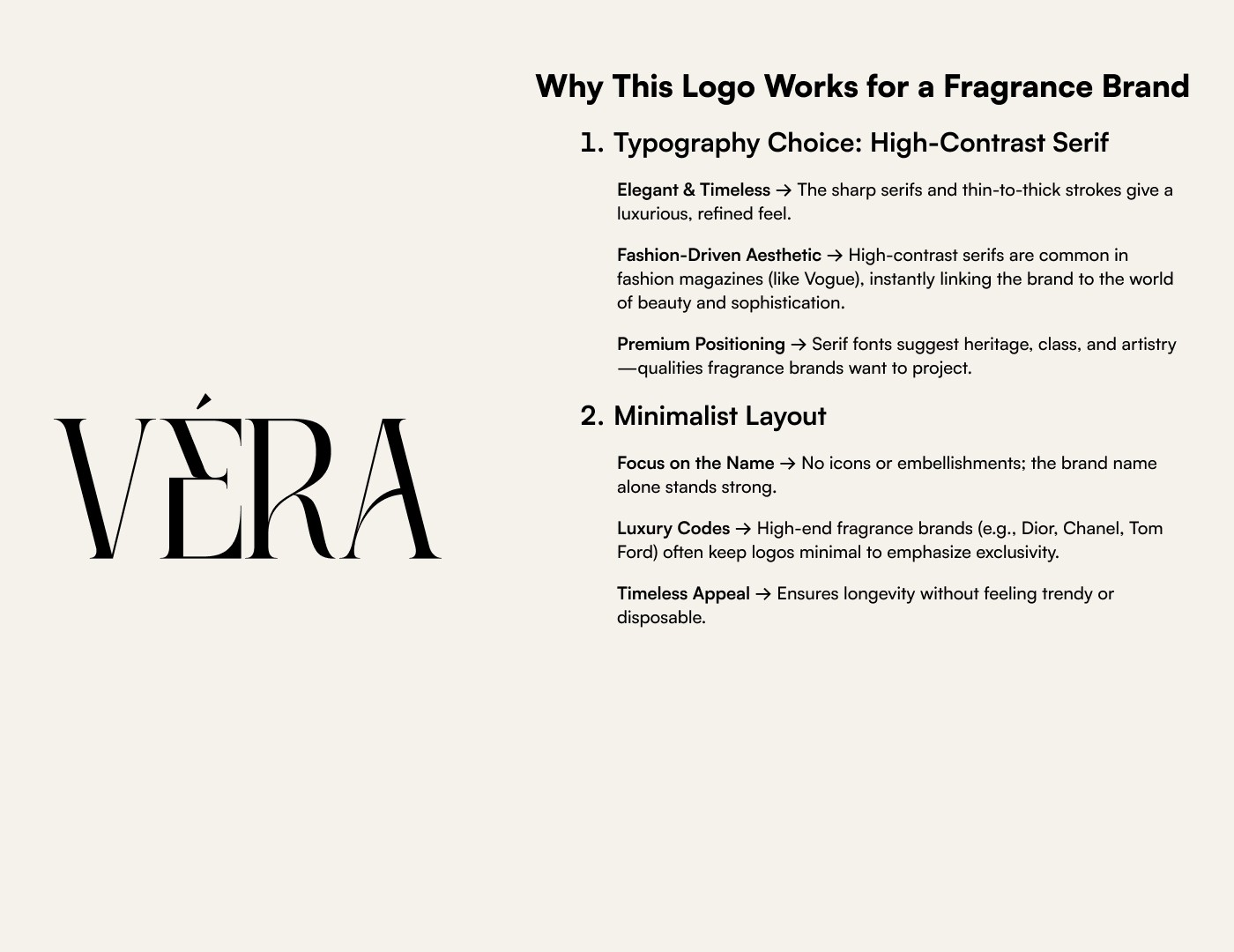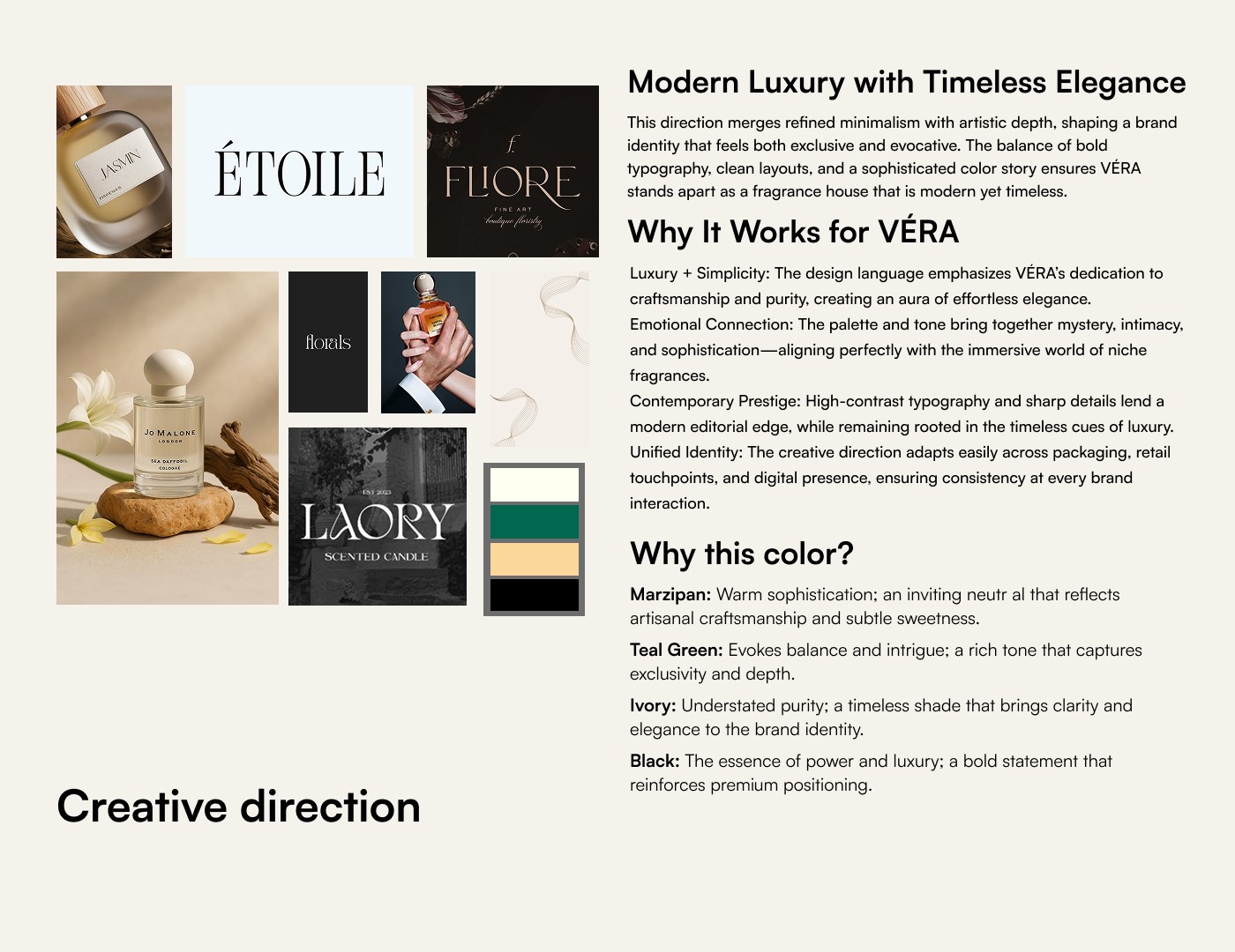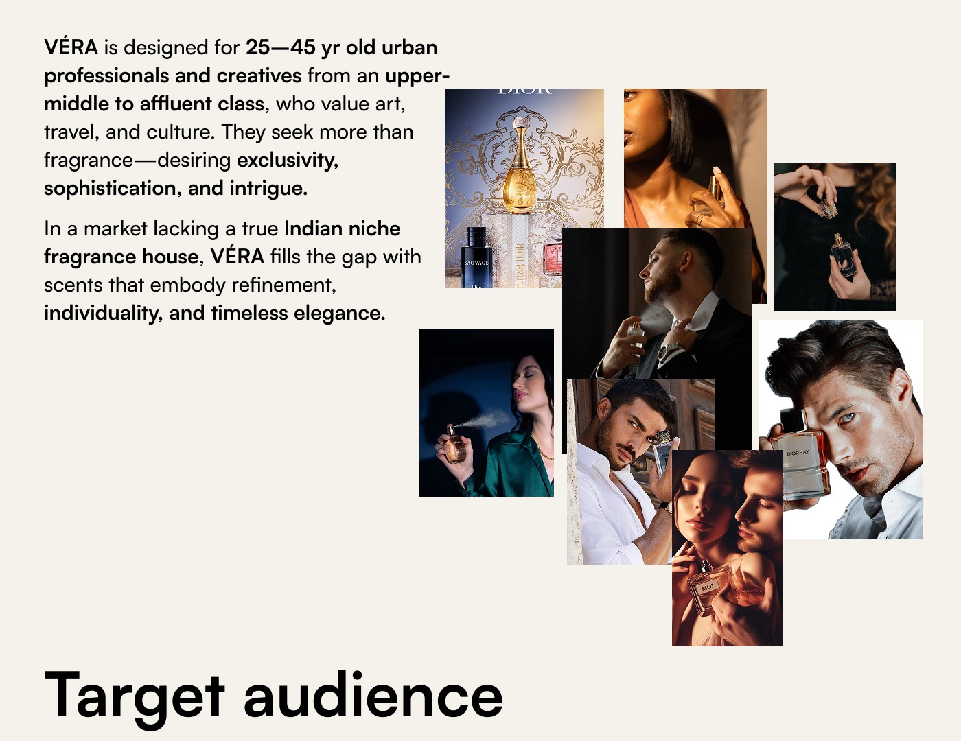 VÉRA is a luxury fragrance house founded in 2024, inspired by the Latin word “Véra” meaning truth and purity. The brand blends Indian heritage with global artistry, offering niche perfumes that evoke emotions, memories, and timeless elegance. The final logo uses refined serif typography with the accented “É” as a symbol of uniqueness and sophistication. Paired with a rich palette of Marzipan, Teal Green, Ivory, and Black, the identity reflects sensuality, mystery, and elegance while staying versatile across packaging, digital, and retail. With values of authenticity, storytelling, craftsmanship, and sustainability, VÉRA positions itself as India’s first true global niche fragrance house.